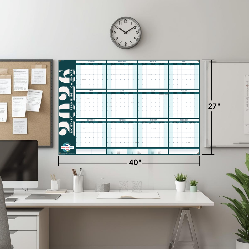 Stay organized and plan ahead with this vibrant 2026 Monthly Planning Calendar. Measuring a generous 40 inches by 27 inches, this horizontal calendar offers ample space to jot down appointments, deadlines, and important events. The bold teal design ensures that your schedule stands out, making it easy to spot key dates at a glance.