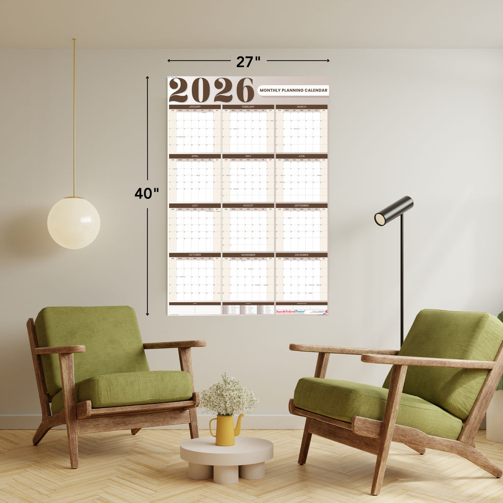 Stay organized and plan ahead with this vibrant 2026 Monthly Planning Calendar. Measuring a generous 40 inches by 27 inches, this vertical calendar offers ample space to jot down appointments, deadlines, and important events. The bold brown design ensures that your schedule stands out, making it easy to spot key dates at a glance.