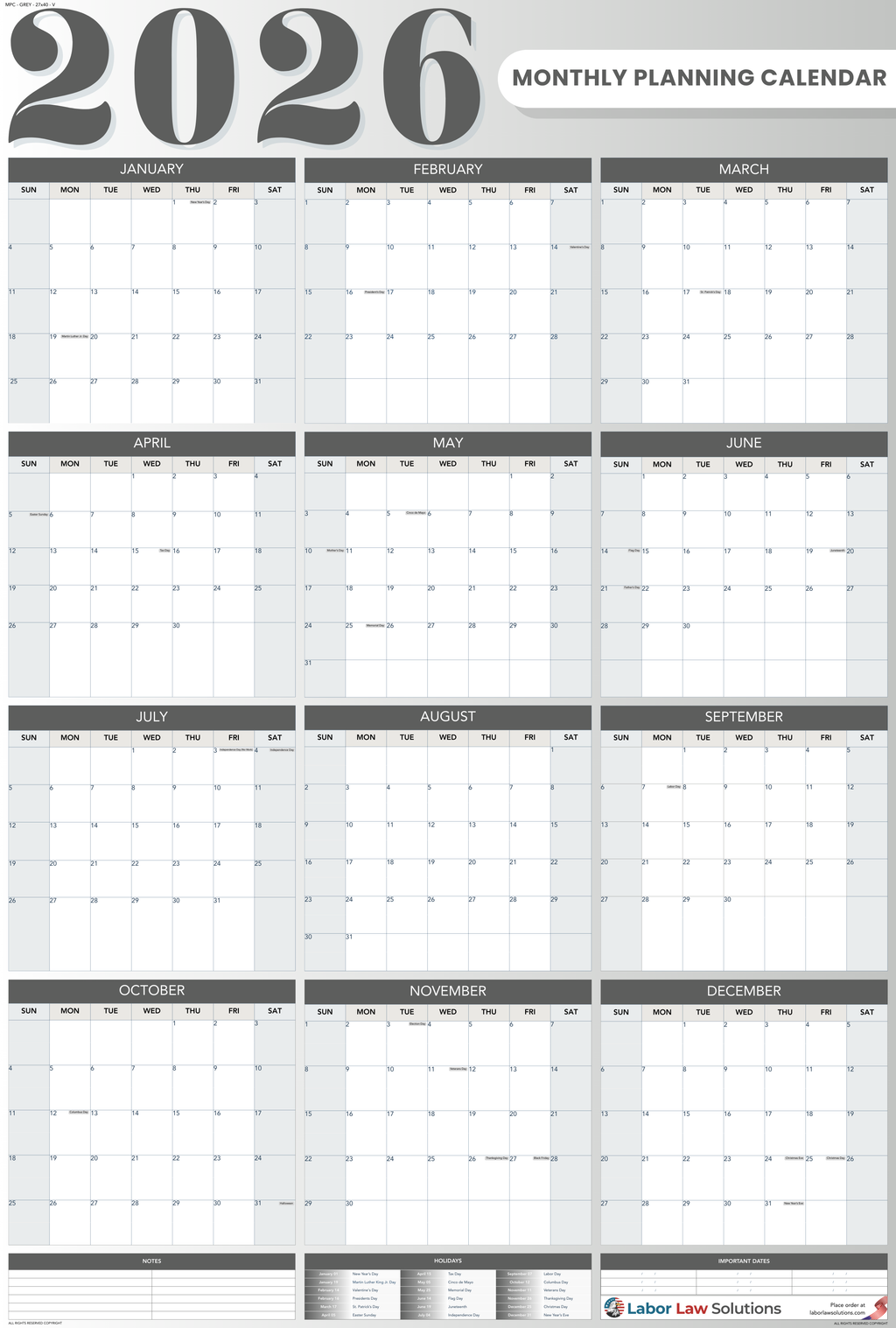 Stay organized and plan ahead with this vibrant 2026 Monthly Planning Calendar. Measuring a generous 40 inches by 27 inches, this vertical calendar offers ample space to jot down appointments, deadlines, and important events. The bold grey design ensures that your schedule stands out, making it easy to spot key dates at a glance.
