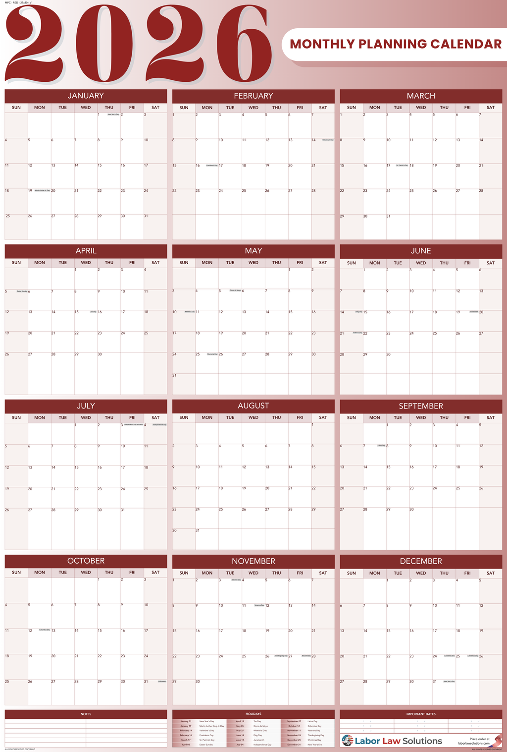 Stay organized and plan ahead with this vibrant 2026 Monthly Planning Calendar. Measuring a generous 40 inches by 27 inches, this vertical calendar offers ample space to jot down appointments, deadlines, and important events. The bold red design ensures that your schedule stands out, making it easy to spot key dates at a glance.